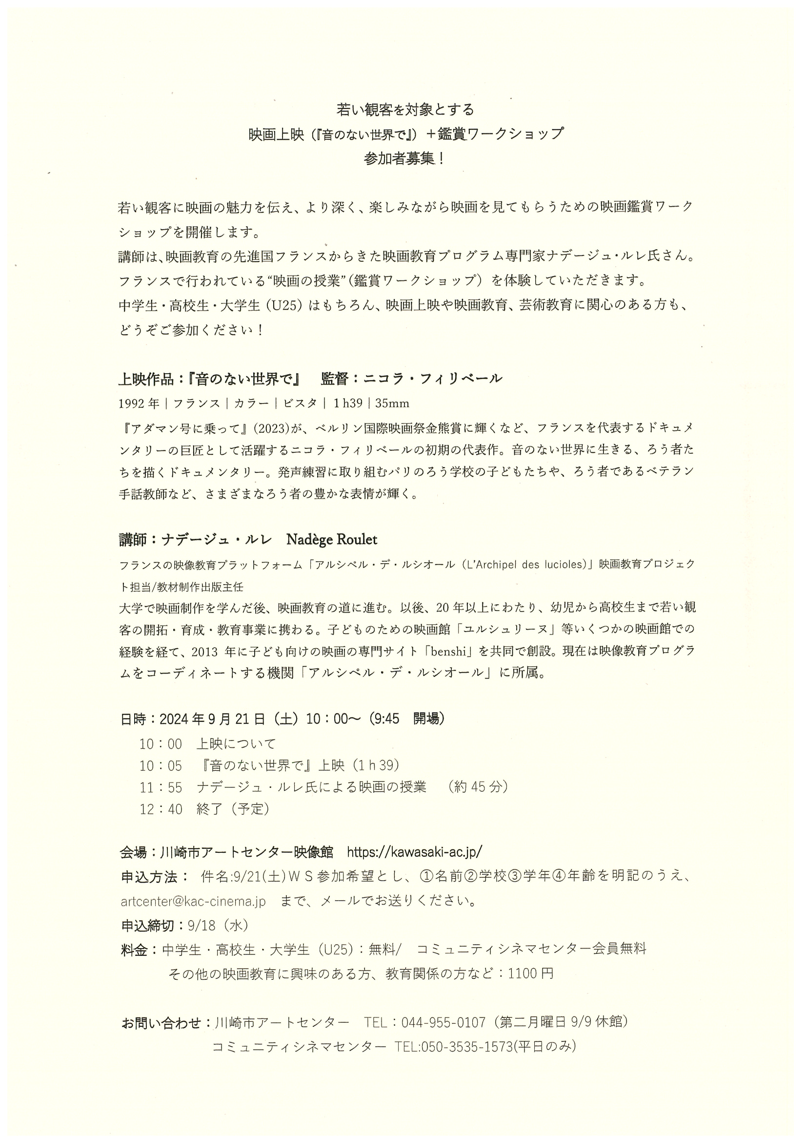 中・高・大学生(U25)を対象にした映画鑑賞ワークショップを行います。作品は『音のない世界で』(1992|フランス|監督:ニコラ・フィリベール)講師はフランスの映画教育プラットフォーム「アルペシル・デ・ルシオール」映画教育プロジェクト担当のナデージュ・ルレさんです。事前申し込み制