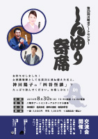 | 交流会 | 公演終了後、演者との交流会を開催します。 この貴重な機会に、噺家たちとお話してみませんか。 ご参加ご希望のお客様は、当日受付にてお申込み下さい。 (1時間程度。飲食含む参加費1,000円) |