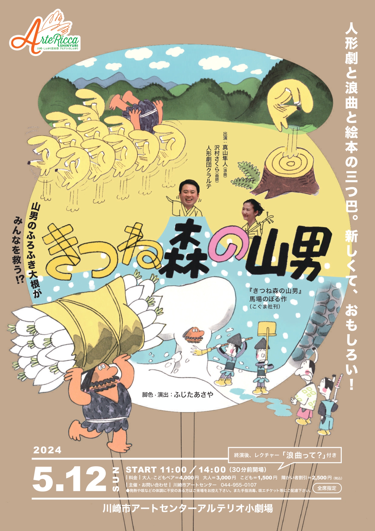 | キャスト・スタッフ | 原作:「きつね森の山男」(馬場のぼる作、こぐま社刊) 脚色・演出:ふじたあさや 人形美術:松原康弘(人形劇団クラルテ) 舞台美術・映像プラン:サカイヒロト 美術製作:人形劇団クラルテ美術部 宣伝美術:升田学 テーマ音楽:藤原豊(東京音楽大学:同大学院教授) 企画:古賀恵子(人形劇団クラルテ)、三戸俊徳(公益財団法人宝塚市文化財団) 制作:公益財団法人宝塚市文化財団、川崎市アートセンター、三戸町 浪曲師:真山隼人 曲師:沢村さくら 人形遣い:人形劇団クラルテ |