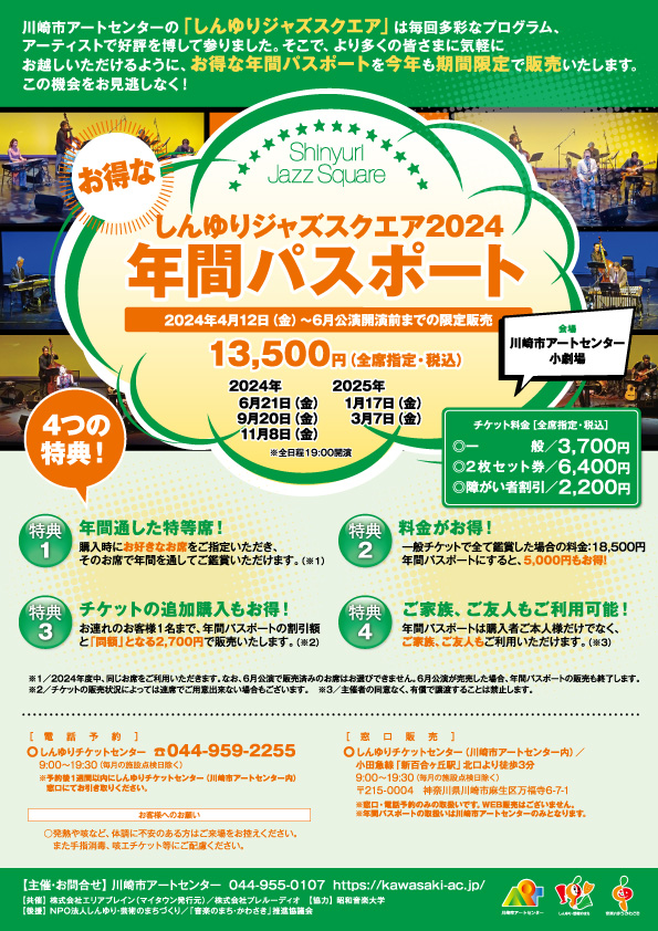 川崎市アートセンターの「しんゆりジャズスクエア」は毎回多彩なプログラム、アーティストで好評を博して参りました。そこで、より多くの皆さまに気軽にお越しいただけるように、お得な年間パスポートを今年も期間限定で販売いたします。この機会をお見逃しなく!