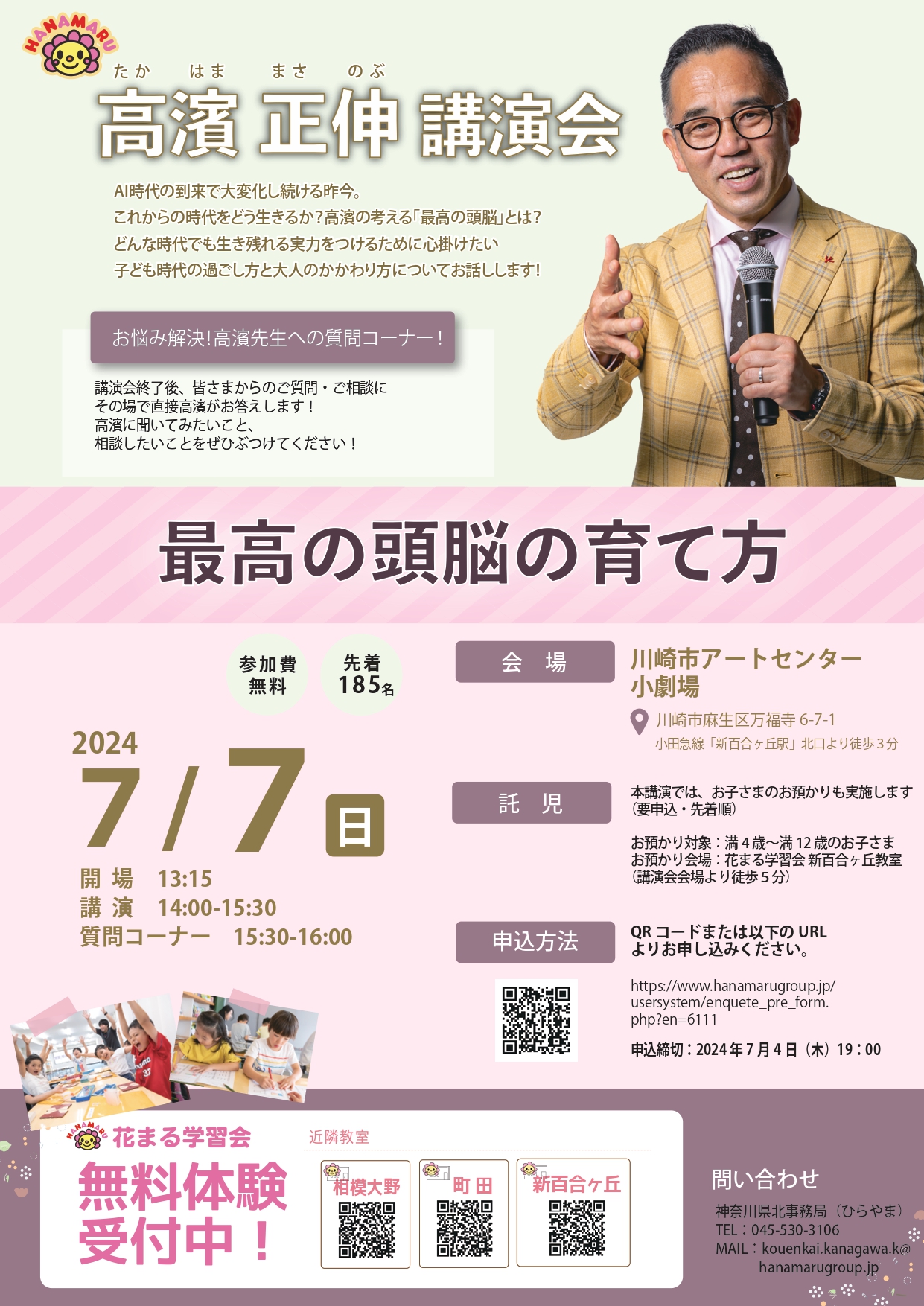 | お問合せ | 花まる学習会 神奈川県北事務局 講演会担当 平山 電話:045-530-3106(平日 11:00~17:00) メール:kouenkai.kanagawa.k@hanamarugroup.jp |