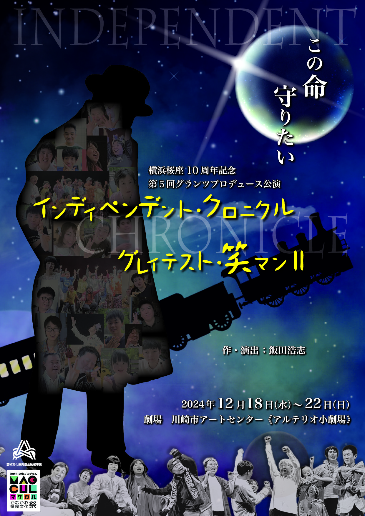 | スタッフ | ■スタッフ 作・演出/飯田浩志 舞台美術/吉野章弘 音楽・演奏/印南俊太朗 照明/冨田まゆみ (東京舞台照明) 音響/香田泉 宣伝美術・ムーブメント/古木杏子 アクション指導/青山郁彦 衣装/髙木渚 鑑賞サポート/舞台ナビLANP・字幕サークルまじっく 舞台監督/赤坂有紀子 舞台監督助手/山形敏之・鈴木暢海 演出助手/吉本穂果 ※吉=つちよし 制作/平田愛奈 制作協力/長尾敦・井村恵美(葉衣企画)・山田真里亜 製作 一般社団法人グランツ 協力 劇団俳優座 劇団文化座 青年座映画放送 劇団新人会 テアトル・エコー HANATOMO演仕屋 劇団キンダースペース タテヨコ企画 TOKYOハンバーグ 少年王者舘 アトリエ・センターフォワード 葉衣企画 社会福祉法人横浜市リハビリテーション事業団 助成 第5回グランツプロデュース公演「インディペンデント・クロニクル」「グレイテスト・笑マンⅡ」は芸術文化振興基金・神奈川県マグカル展開促進補助金・公益財団法人 全国税理士共栄会文化財団の助成を受けて実施しています |
