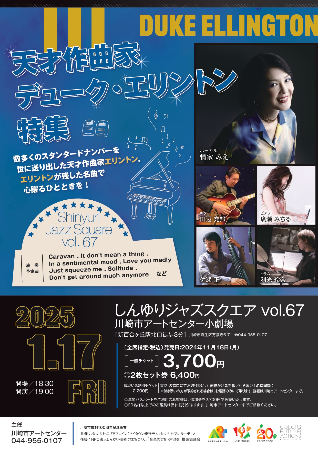 | お問合わせ | 川崎市アートセンター 044-955-0107 9:00~19:30(毎月の施設点検日および12/29~1/3のぞく) 共催:株式会社エリアブレイン(マイタウン発行元)、株式会社プレルーディオ 後援:NPO法人しんゆり・芸術のまちづくり、「音楽のまち・かわさき」推進協議会 |
