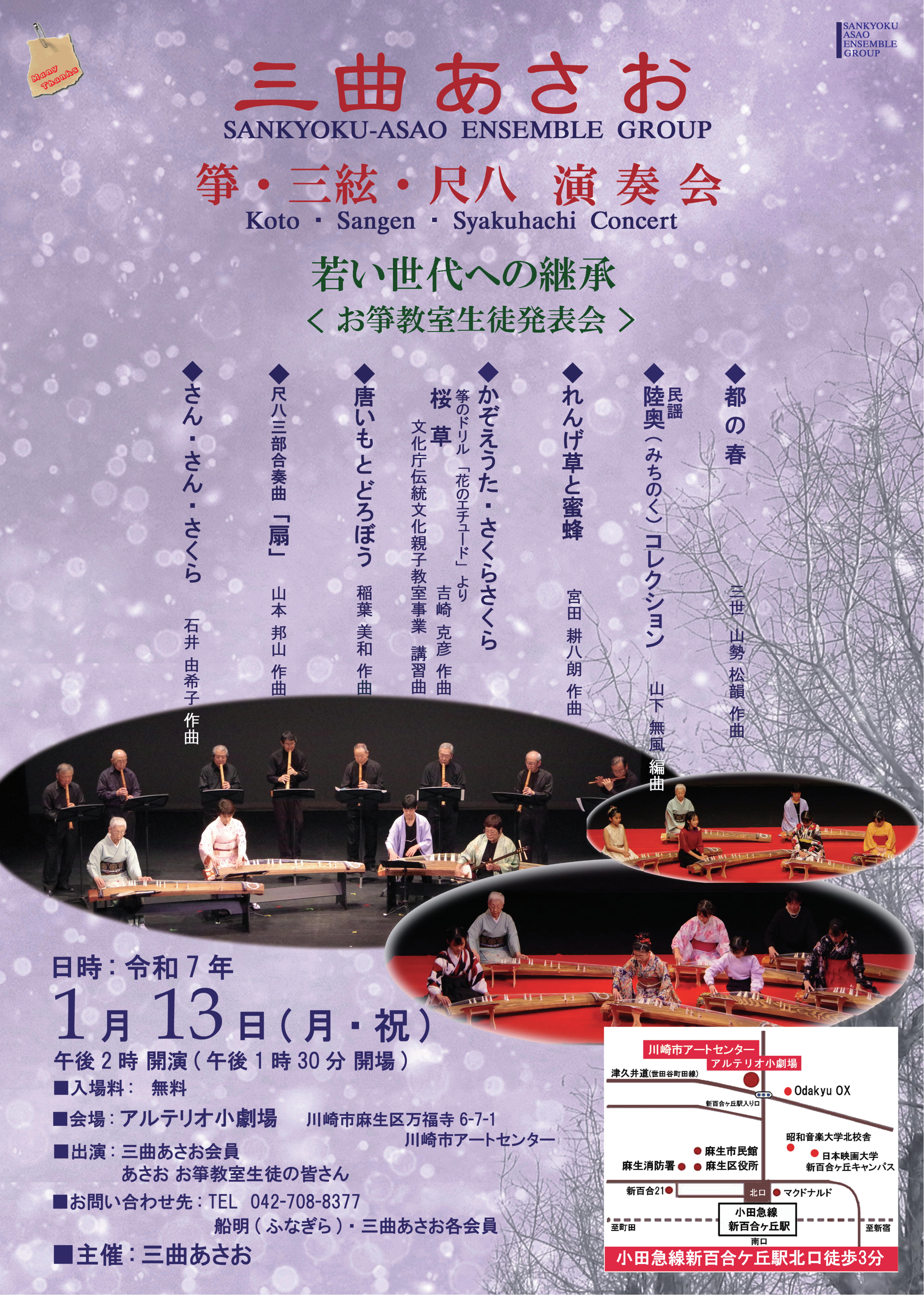 地元麻生区の三曲合奏サークル“三曲あさお”メンバーの日頃の練習成果、および“お箏教室”で練習に励んだ子供たちの成果発表です。