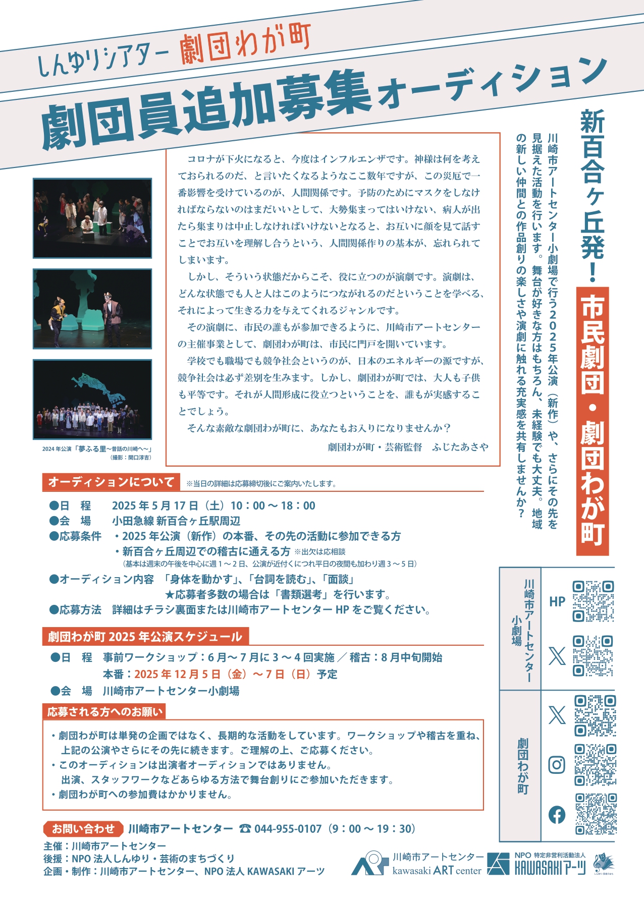 | お問い合わせ | 川崎市アートセンター 044-955-0107(9:30-19:30) ※システムの都合上、下記に<公演日>の欄がございますが、こちらは<オーディション開催日>の日程です。詳細は上記のスケジュールまたはチラシデータをご参照ください。 |
