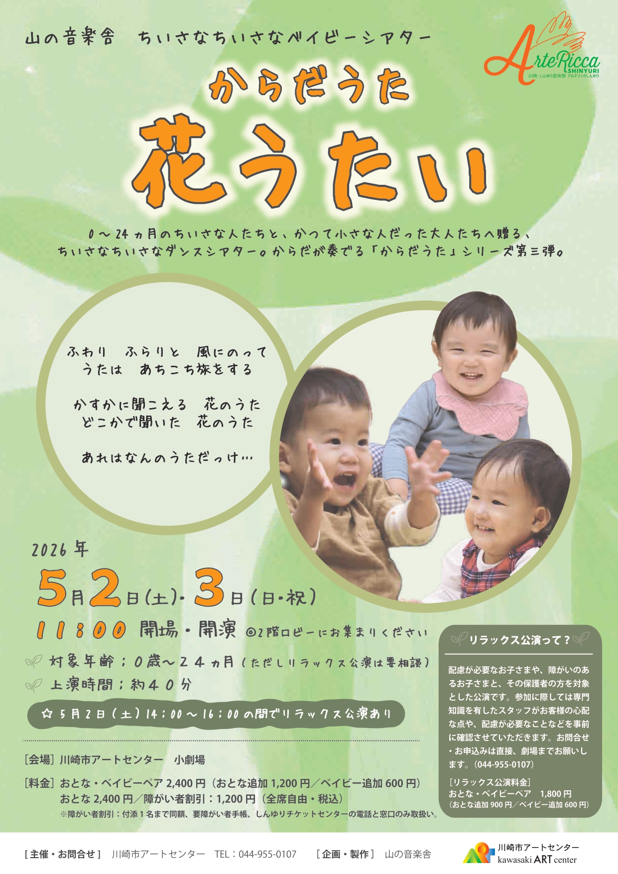 | 料金 | 【全席自由・税込】 おとな・ベイビーペア 2,400円(おとな追加 1,200円、ベイビー追加 600円)おとな 2,400円、障がい者割引 1,200円 ※対象年齢:0歳~24ヵ月(対象年齢以外はご来場いただけません。ただしリラックス公演は要相談。) ※障がい者割引:付添1名まで同額、要障がい者手帳、しんゆりチケットセンターの電話と窓口のみ取扱い。 ※リラックス公演は劇場へ要相談 Tel:044-955-0107 おとな・ベイビーペア 1,800円(おとな追加 900円、ベイビー追加 600円) |