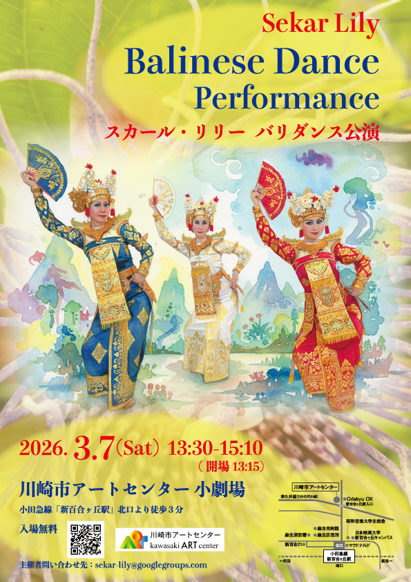 | スカール・リリーについて | 1993年に小田急線の新百合ヶ丘に誕生したバリダンスグループです。 現在、約15名が在籍、川崎北部や世田谷区でレッスンし、発表会としてバリダンス 公演を年に1回開催しているほか、バリ島の芸術祭、地域やインドネシア関連のイベント、老人施設でのボランティアなどにも参加しています。 https://facebook.com/SekarLilyBali |