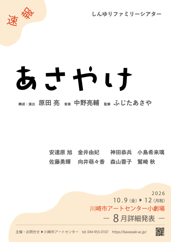 構成・演出:原田亮音楽:中野亮輔監修:ふじたあさや<出演者>※五十音順安達原 旭金井由妃神田恭兵小島希来璃佐藤勇輝向井萌々香森山蓉子鷲崎 秋<公演日程>2026年10月9日(金)~12日(月祝)2026年8月詳細発表<主催・お問合せ>川崎市アートセンター 044-955-0107